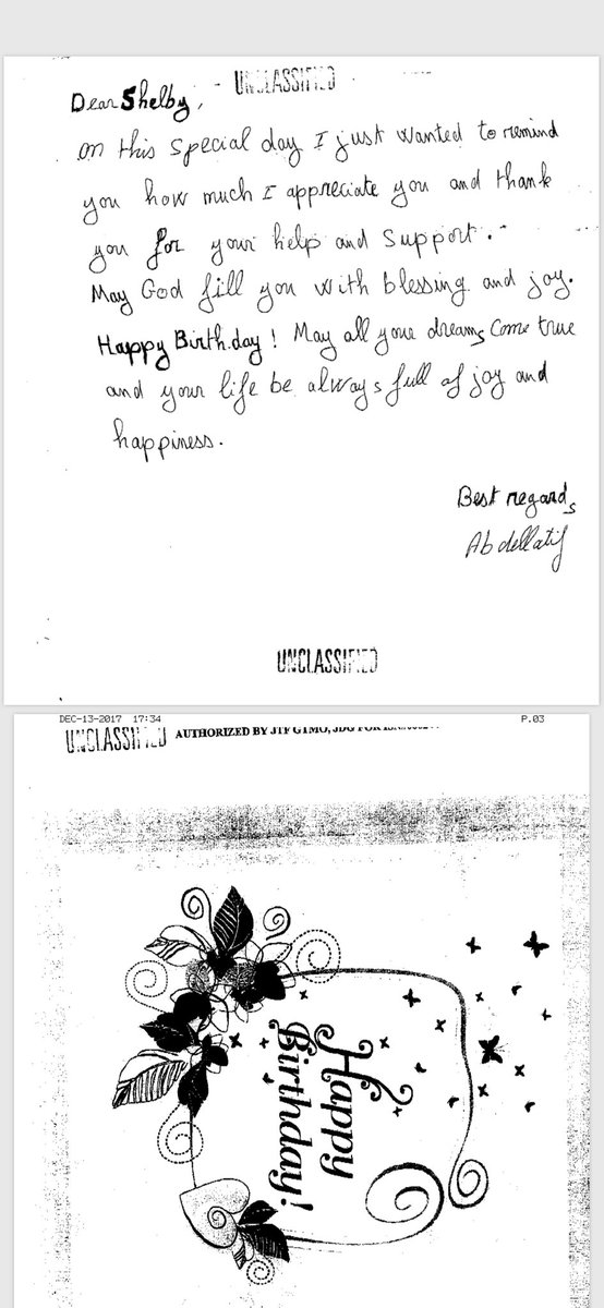 The birthday card that Abdul Latif Nasser, sent to his lawyer, Shelby Sullivan-Bennis. Nasser is one of five men still held who were approved for release before Donald Trump took office last January.As Shelby Sullivan-Bennis of Reprieve, who represents prisoners including Abdul Latif Nasser, one of the five men approved for release but still held, stated in a tweet after the ruling was issued, “Well, today the court ordered Trump to articulate a damn policy on Guantánamo & explain why my clients who’ve never been charged w[ith] a crime AND were unanimously cleared for release (including the Moroccan author of this birthday card [see left]) remain locked in that black hole. A good day.”