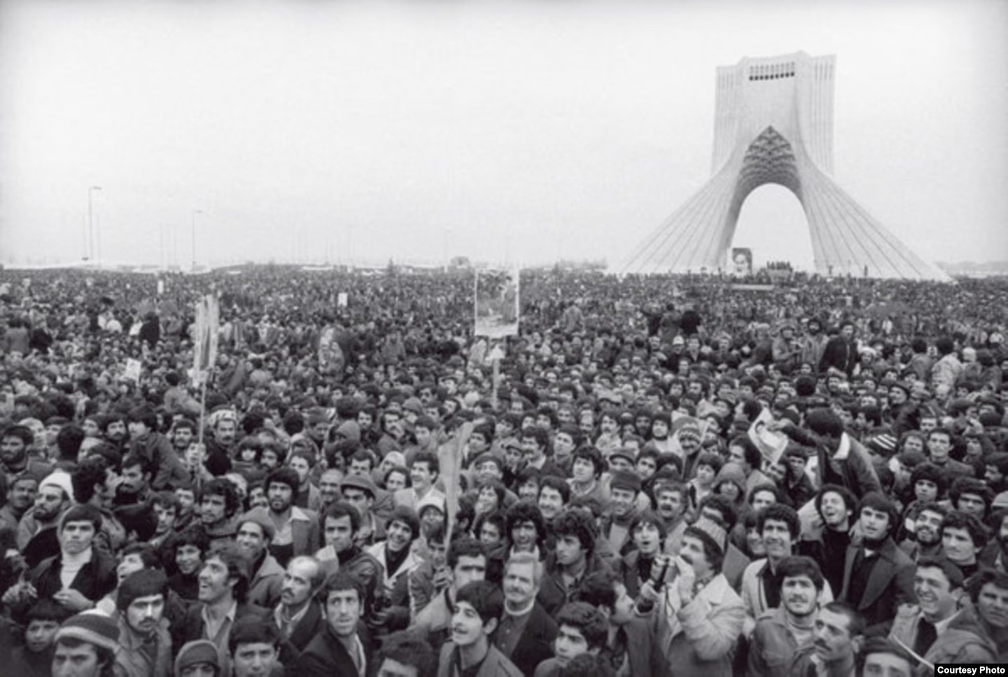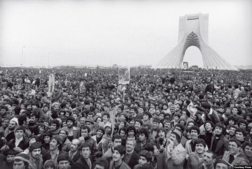 A scene from the Iranian Revolution in 1979, with a million people gathered in Tehran.