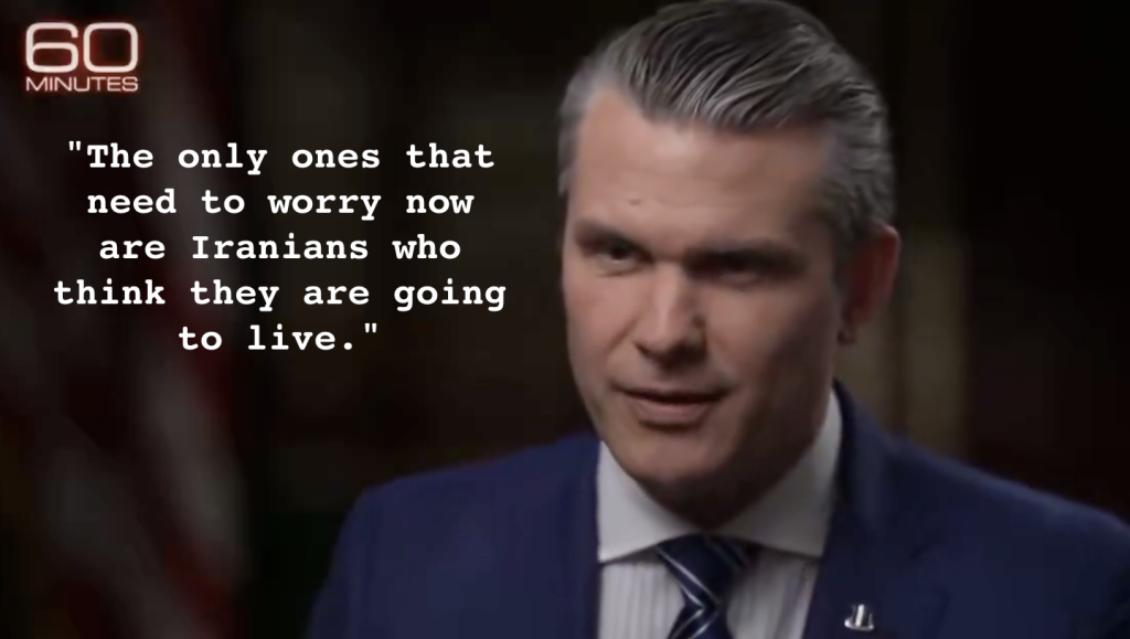 Interviewed on “60 Minutes” on March 7, Hegseth plumbed even greater depths of depravity, saying, of the Iran people, that “The only ones who need to be worried right now are Iranians who think they’re going to live”, which, as I noted at the time, appeared to show him “promising the genocidal extermination of the entire Iranian people, akin to the genocidal intent displayed by Israeli leaders after Oct. 7 towards the entire population of Gaza.”